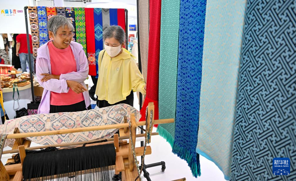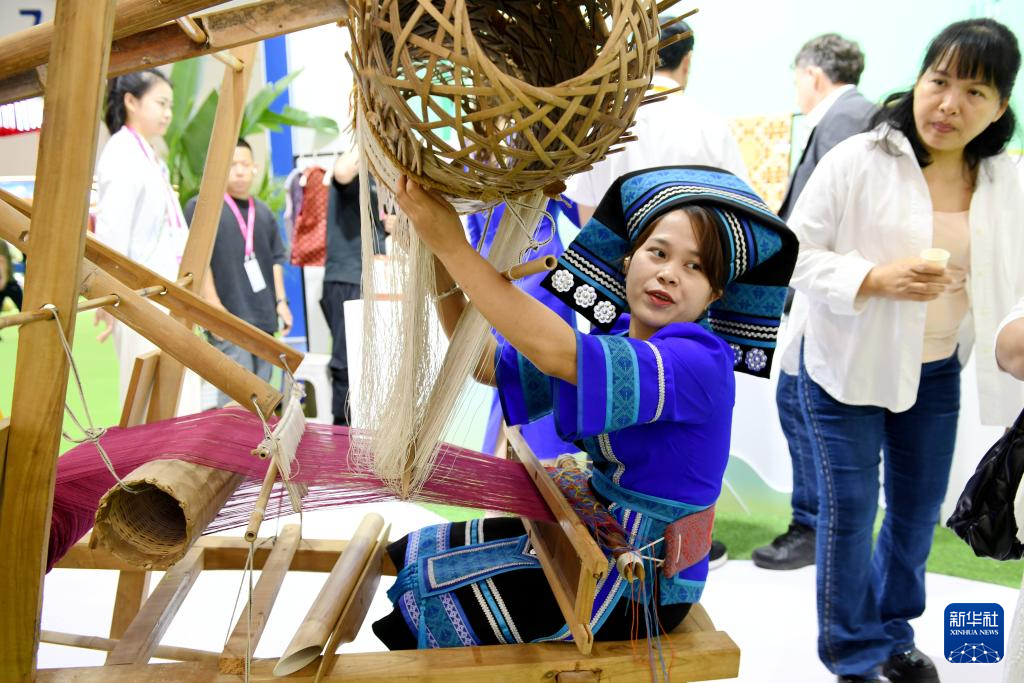 4月15日,工作人員在第五屆消博會廣西展臺為參觀者演示并介紹壯族織錦技藝。壯族織錦技藝是國家級非物質文化遺產。
