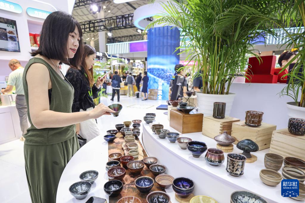 4月15日,觀眾在消博會上參觀建盞產品。建窯建盞燒制技藝是國家級非物質文化遺產。