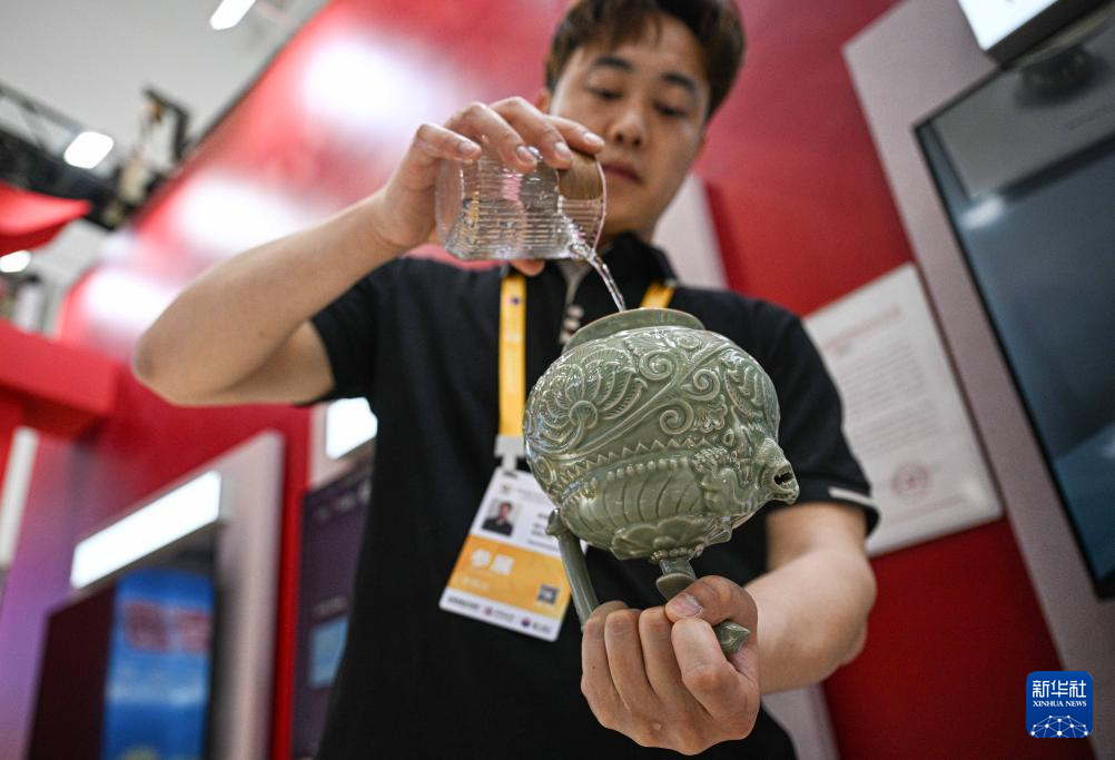 4月15日,工作人員在第五屆消博會陜西館展示耀州窯倒裝壺。耀州窯陶瓷燒制技藝是國家級非物質文化遺產。