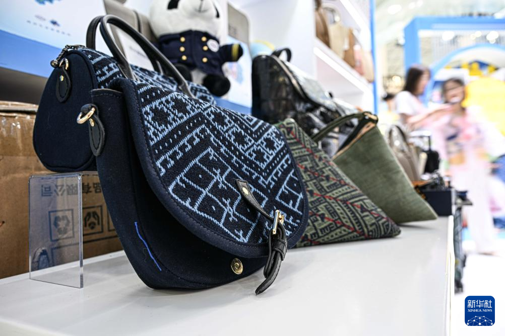 4月15日在第五屆消博會海南館拍攝的帶有黎錦元素的手包。黎族傳統紡染織繡技藝被列入人類非物質文化遺產代表作名錄。