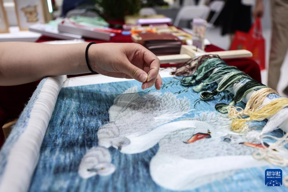 4月15日,參展商在消博會上制作湘繡。湘繡是國家級非物質文化遺產。