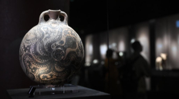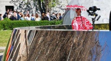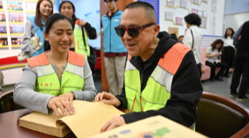 4月16日,非遺傳承人在2025哈爾濱市開江民俗文化周啟動儀式現場展示用魚皮、樺樹皮和秸稈制作的作品。