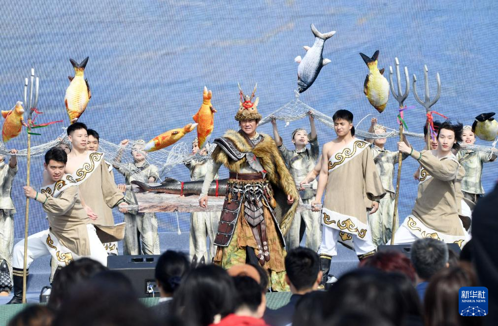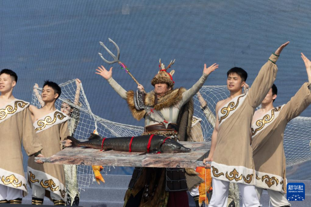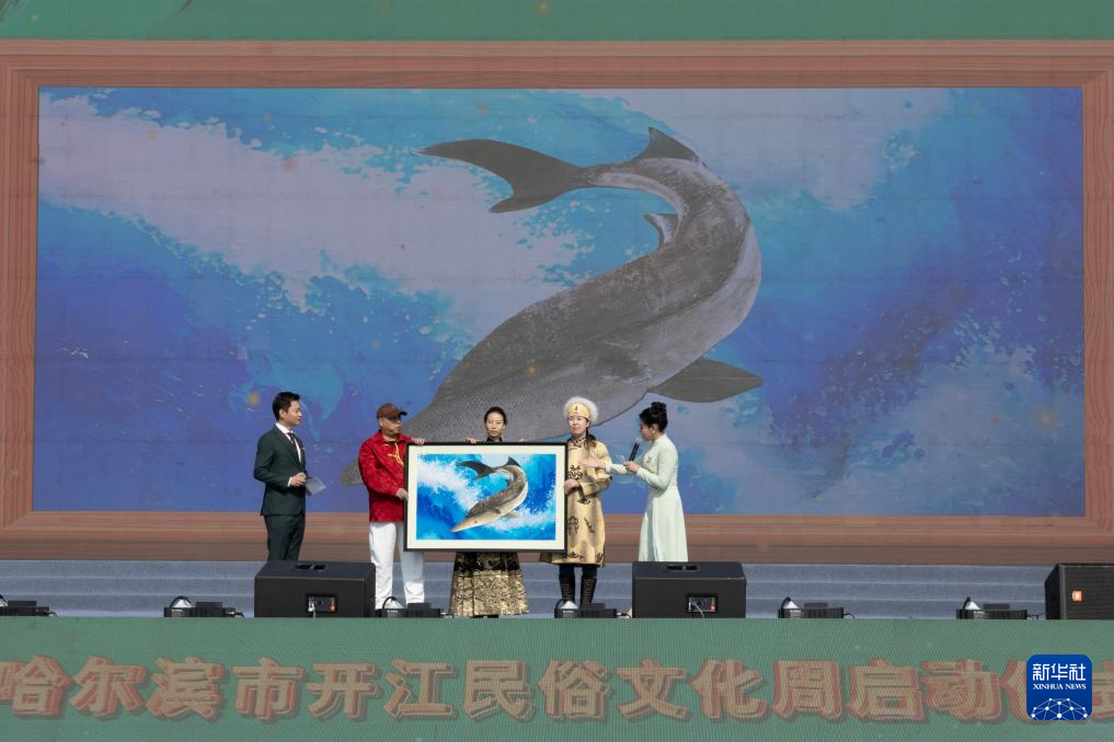 4月16日,演職人員在2025哈爾濱市開江民俗文化周啟動儀式現場展示“頭魚”。