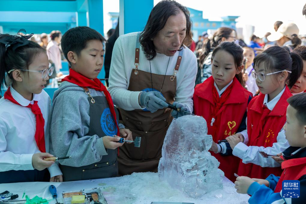 4月16日,非遺傳承人在2025哈爾濱市開江民俗文化周啟動儀式現場展示冰雕技巧。