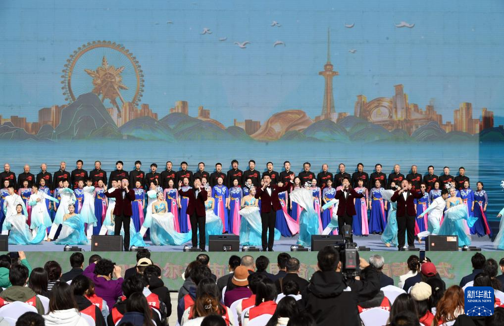 4月16日,演職人員在2025哈爾濱市開江民俗文化周啟動儀式現場合唱《大開江》。