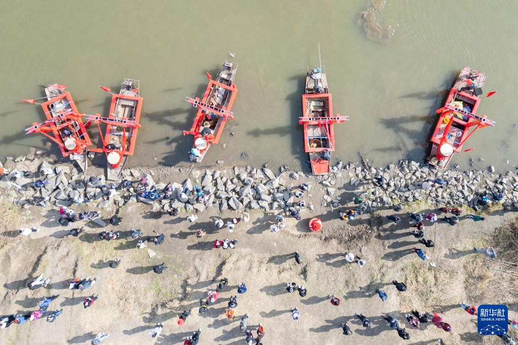 4月16日,人們在2025哈爾濱市開江民俗文化周啟動儀式現場參觀開江捕魚的船只(無人機照片)。