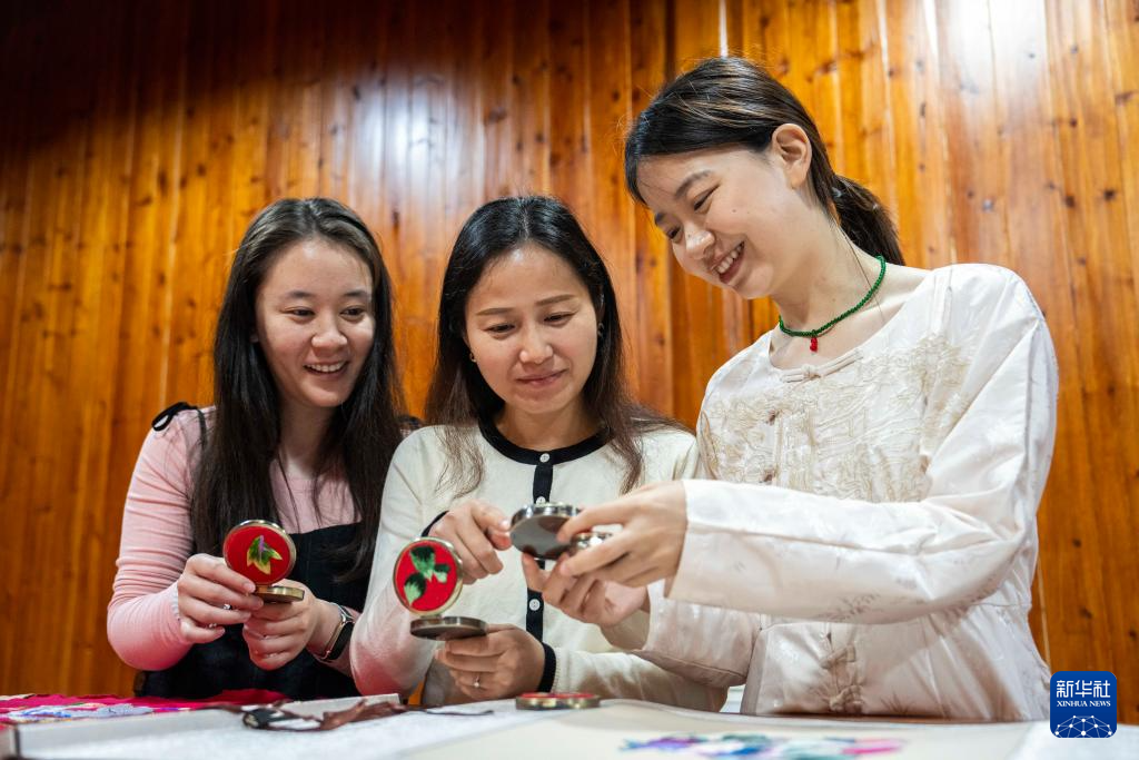 4月16日,在桃源縣鄭家驛鎮梨子崗村齊繪繡莊,肖瑤(右)向游客介紹含有桃源刺繡元素的可折疊化妝鏡。