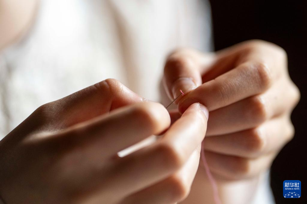 4月16日,在桃源縣鄭家驛鎮梨子崗村齊繪繡莊,肖瑤在穿針引線。