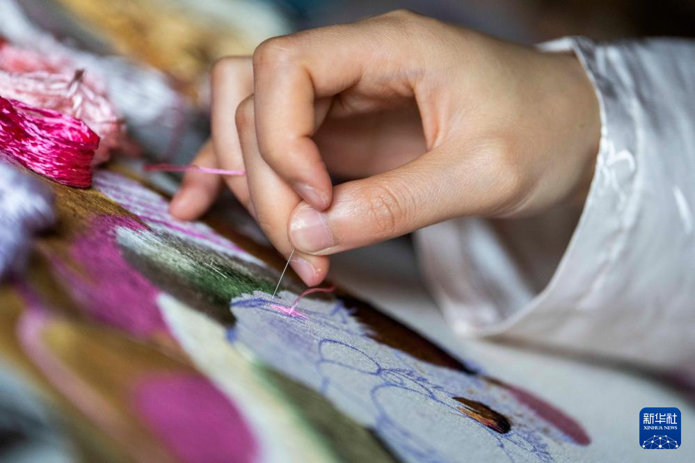 4月16日,在桃源縣鄭家驛鎮梨子崗村齊繪繡莊,肖瑤在進行刺繡創作。