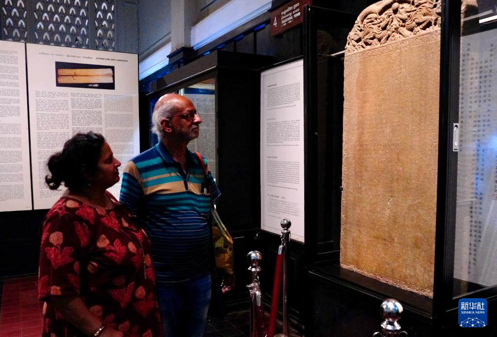 4月17日,在斯里蘭卡科倫坡國家博物館,觀眾參觀鄭和遺存《布施錫蘭山佛寺碑》。
