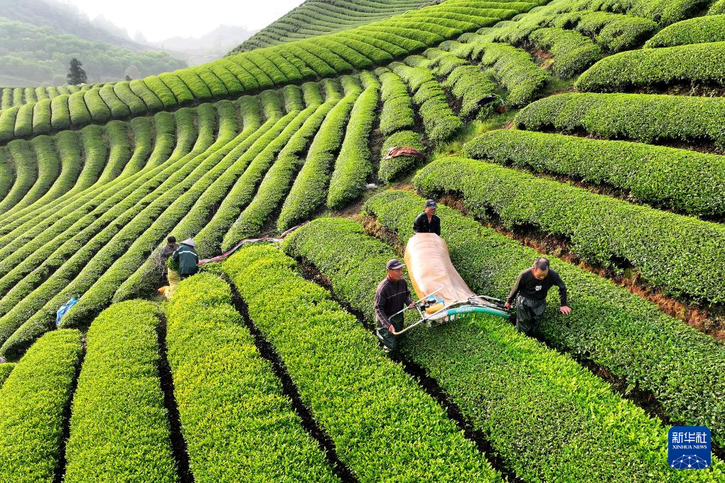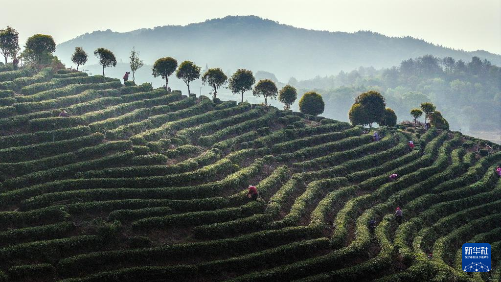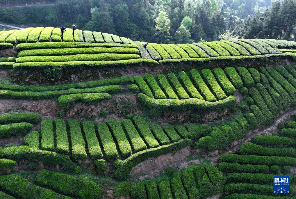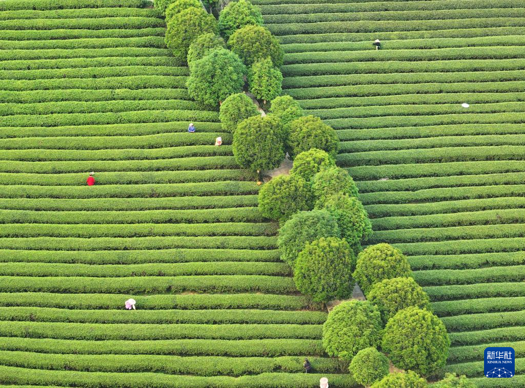 4月1日,茶農在江西省宜春市靖安縣仁首鎮生態茶園內采摘春茶(無人機照片)。