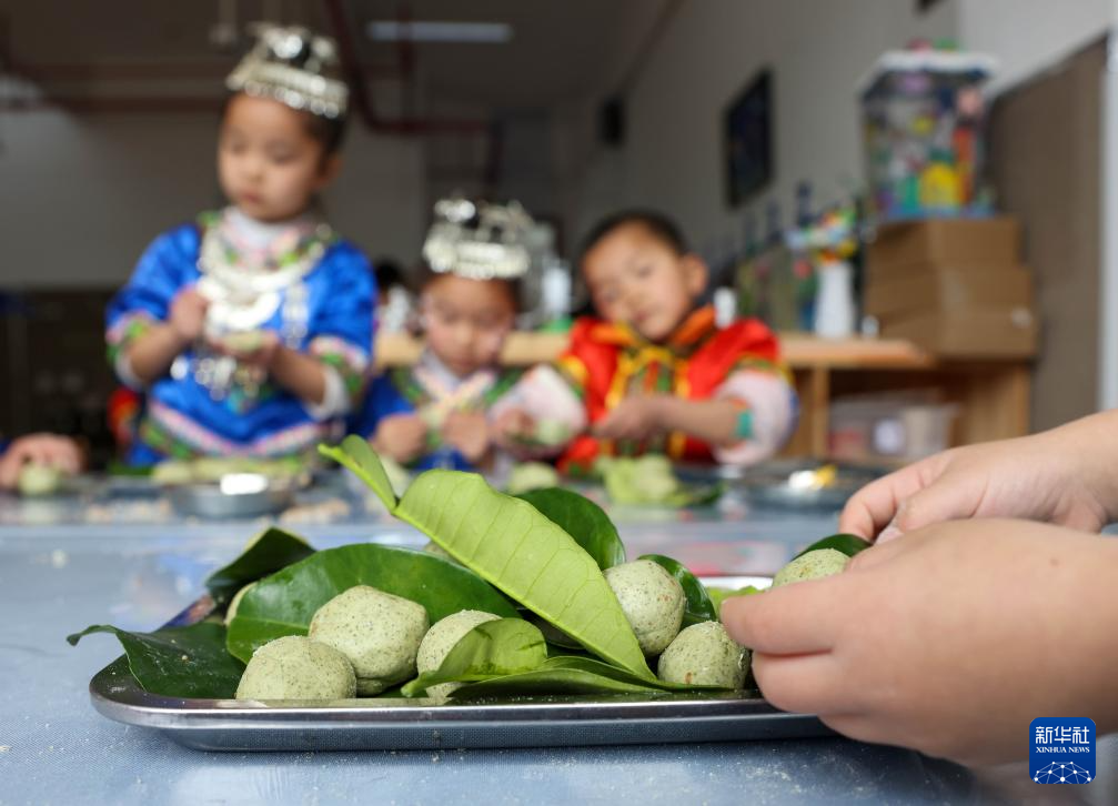 3月31日,農歷三月初三,貴州省銅仁市玉屏侗族自治縣的幼兒園小朋友制作“三月粑”。