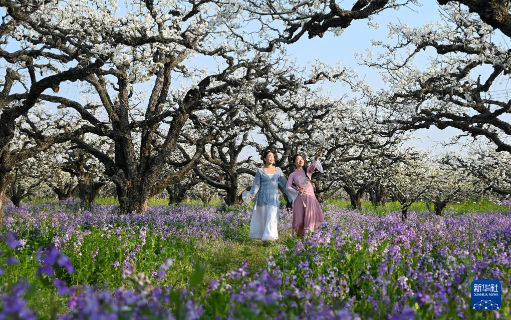 4月4日,游客在安徽省宿州市碭山縣玄廟鎮梨園賞花踏春。