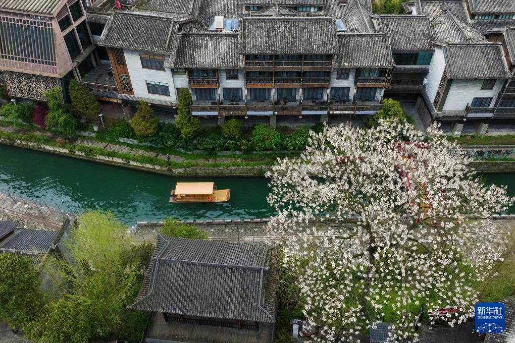 4月4日,游客在重慶市黔江區濯水古鎮乘坐電動竹筏游覽阿蓬江(無人機照片)。