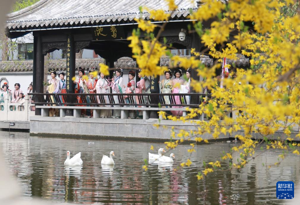 3月29日,在山東省臨沂市王羲之故居,身著傳統服裝的女子參加迎接“三月三”的活動。