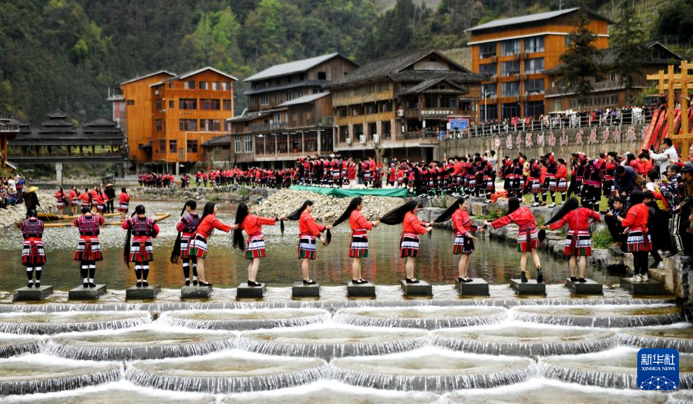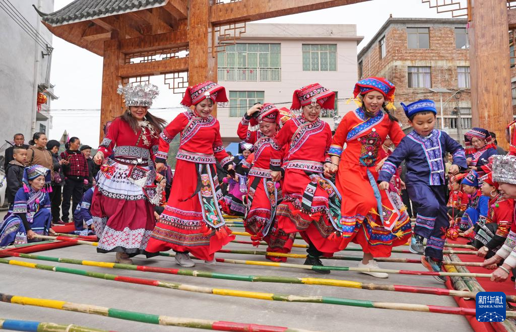 3月31日,人們在廣西柳州市融水苗族自治縣三防鎮的“三月三”活動上跳竹竿。