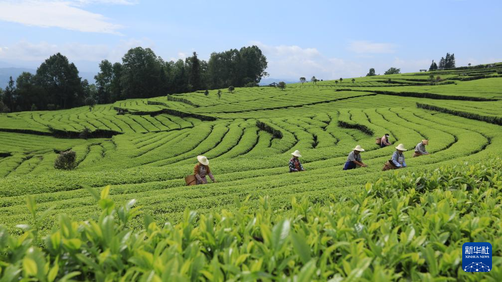 4月17日,在云南省騰沖市團田鄉大坪山茶園,茶農在采摘雨前茶。