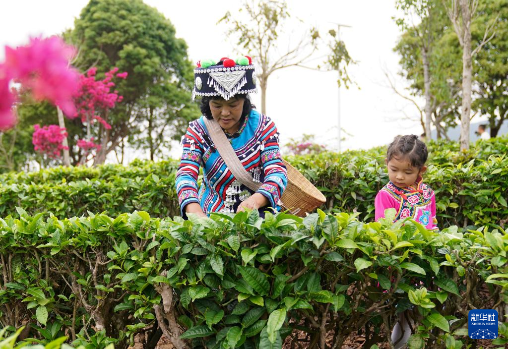 4月3日,在云南省寧洱縣寧洱鎮溫泉村,茶農帶著孩子在茶園采摘春茶。