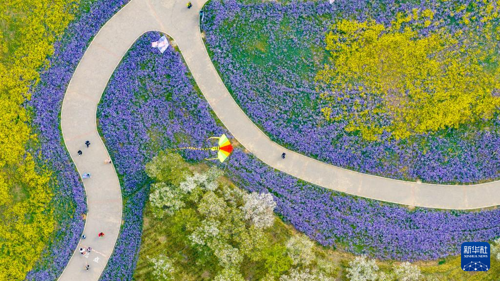 4月4日,市民在江蘇邳州銀杏湖風景區踏青游覽(無人機照片)。