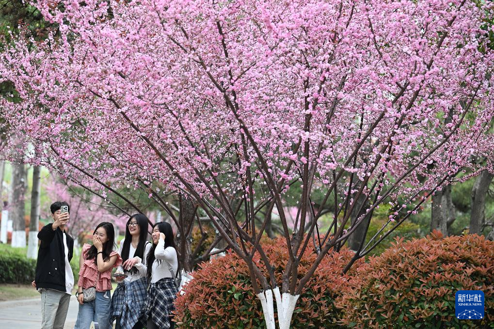 4月4日,游人在河南省商丘市日月湖景區拍照。