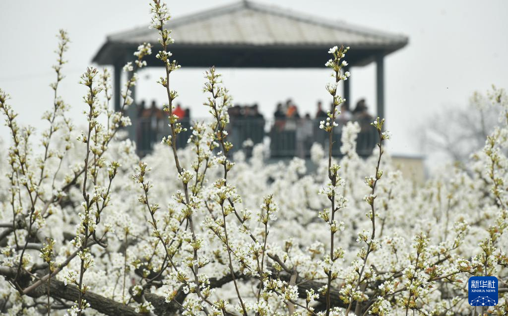 4月4日,游客在河北省滄州市肅寧縣萬里鎮尹家莊村觀景臺欣賞梨花。