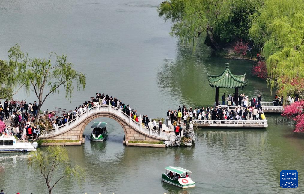 4月4日,游客在江蘇揚州瘦西湖風景區游覽(無人機照片)。