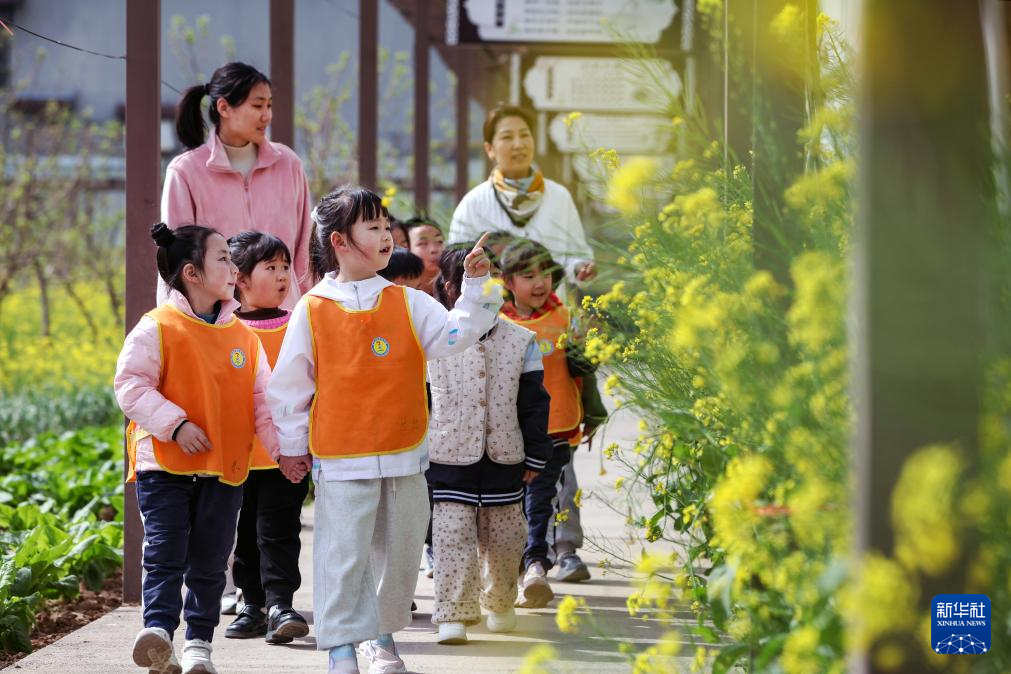 3月31日,農歷三月初三,在河南省焦作市博愛縣九街社區,幼兒園的教師帶領小朋友踏青賞花。