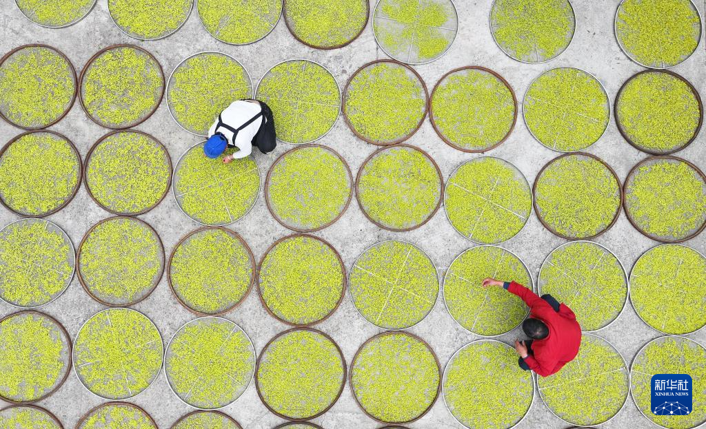 4月7日,在湖南省永州市雙牌縣上梧江瑤族鄉盤家村云臺山生態有機茶園,茶農在攤曬春茶(無人機照片)。
