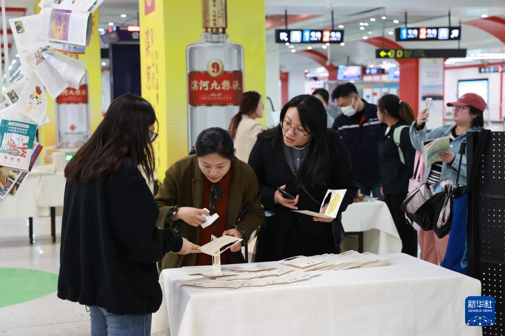 4月21日,市民在甘肅省蘭州市地鐵1號線東方紅廣場站“讀者·文化生活島”主題快閃店內體驗集章打卡文創活動。
