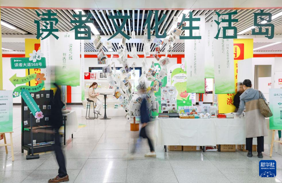 4月21日,市民在甘肅省蘭州市地鐵1號線東方紅廣場站“讀者·文化生活島”主題快閃店內閱讀。