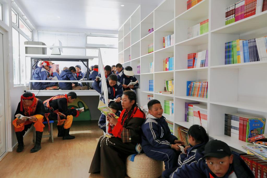 4月22日,青海省玉樹藏族自治州玉樹市安沖鄉中心寄宿制學校的孩子們在“有氧圖書館”里面讀書。(受訪者供圖)
