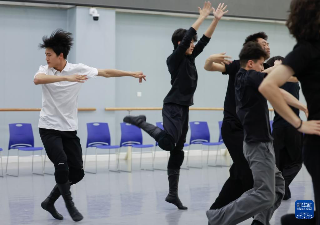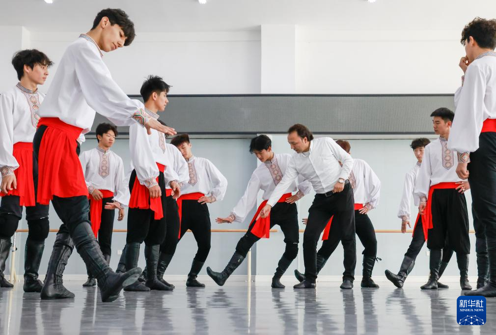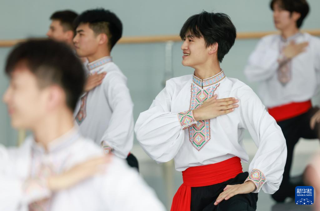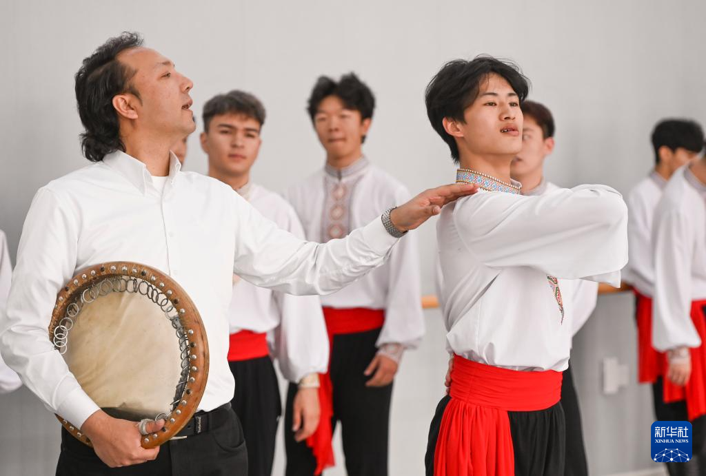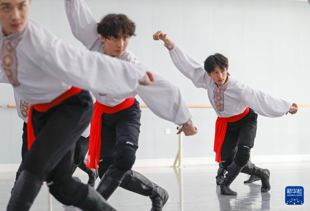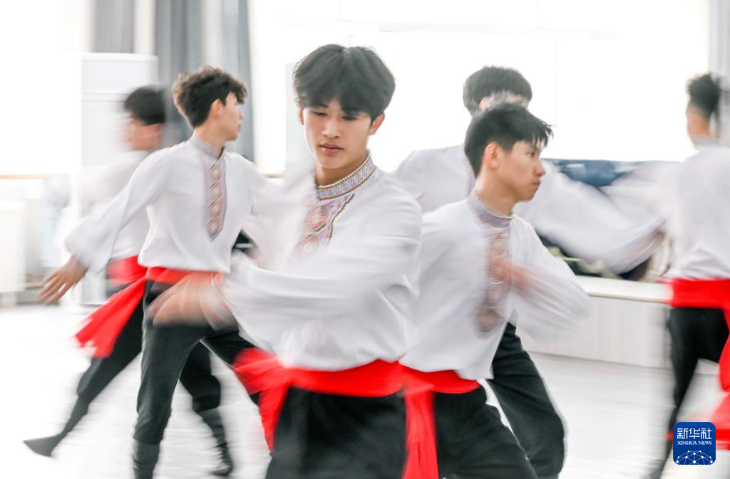 4月14日,羅昊(左)和同學在舞蹈學院專業技能課教室里排練群舞《陽光下的麥蓋提》。