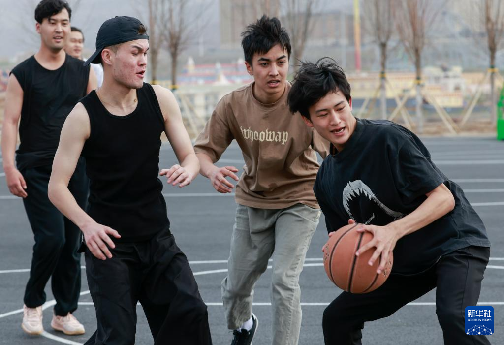 4月18日,羅昊(右)和同學在新疆藝術學院籃球場上打球。