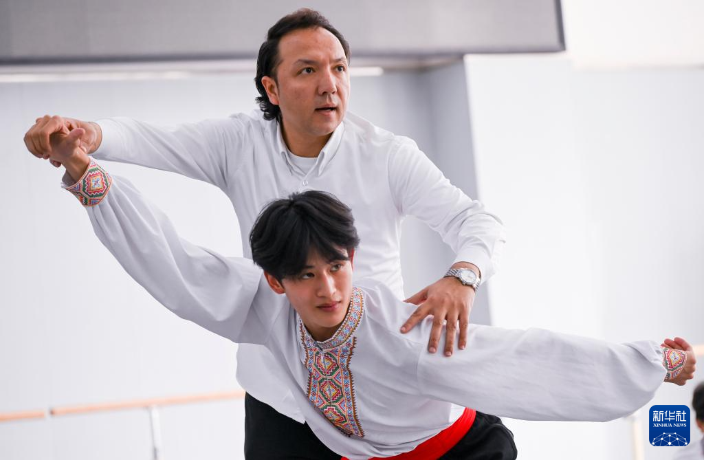 4月14日,羅昊(前)在舞蹈學院教師買買提·馬木提的指導下學習維吾爾族舞蹈。