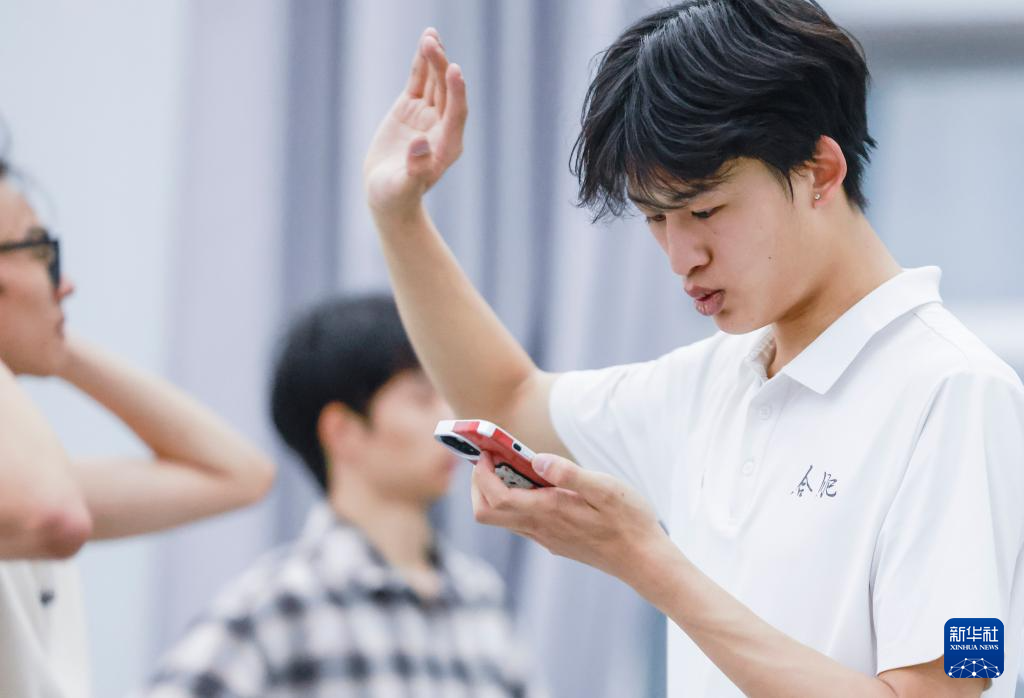 4月14日,羅昊在排練群舞《陽光下的麥蓋提》間隙觀看手機視頻糾正自己的舞蹈動作。
