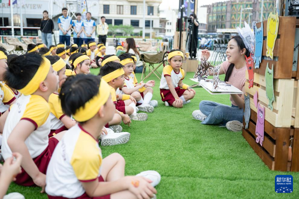 4月23日,澳門小朋友在戶外閱讀區聽老師講故事書。