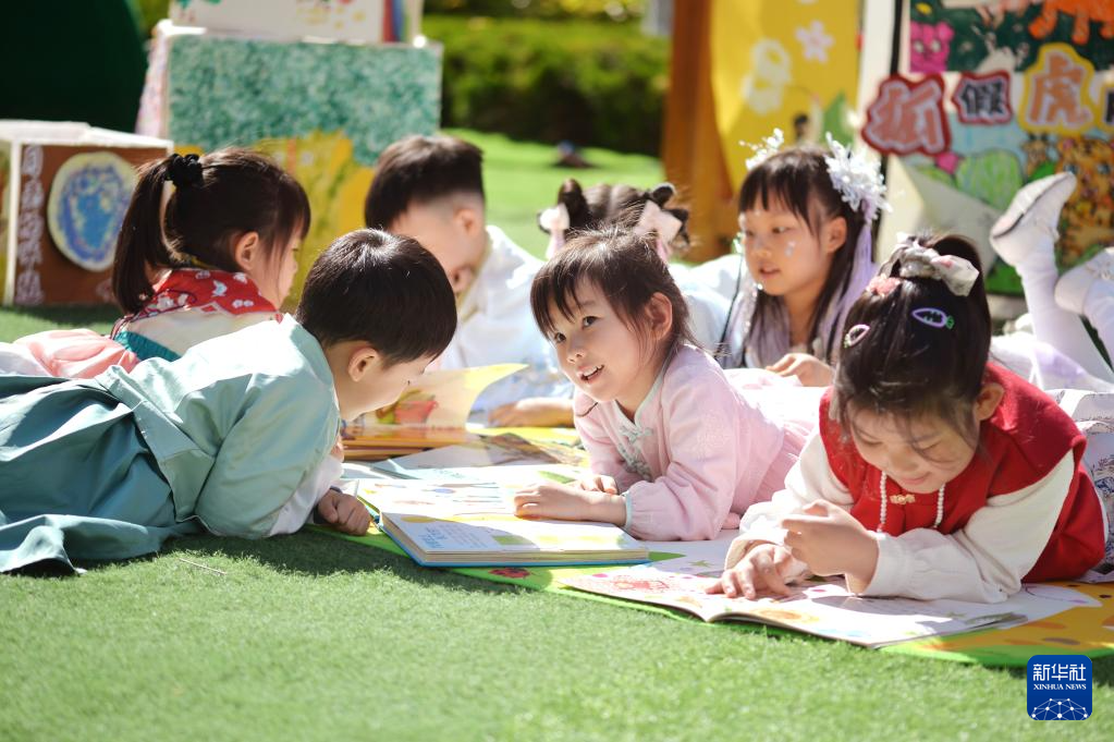 4月23日,在山東省青島市市北區第二實驗幼兒園舉行的讀書節活動上,小朋友們在春光中享受閱讀的樂趣。