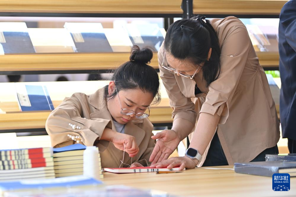 4月23日,在山西太原,讀者在第四屆全民閱讀大會龍城書展上體驗線裝書縫制。