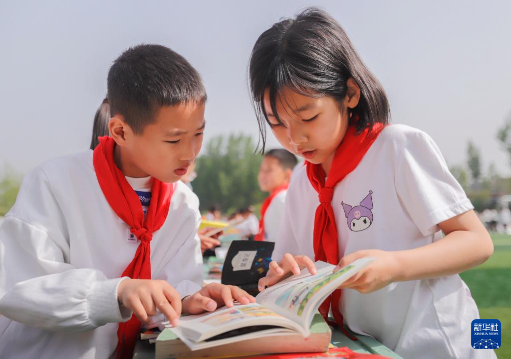 4月23日,在山東省棗莊市市中區文化路小學,兩名學生在校園書吧里閱讀時相互交流。