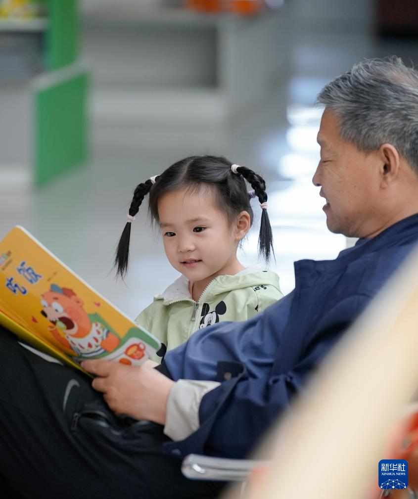 4月23日,在河北省石家莊市平山縣北莊村農家書屋,家長帶著小朋友一起閱讀。
