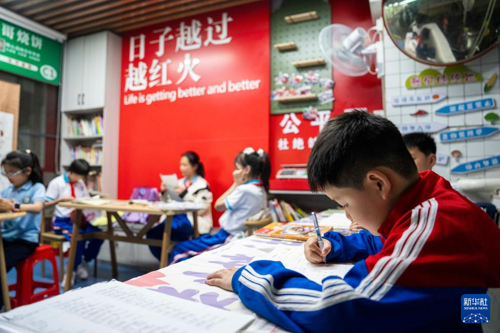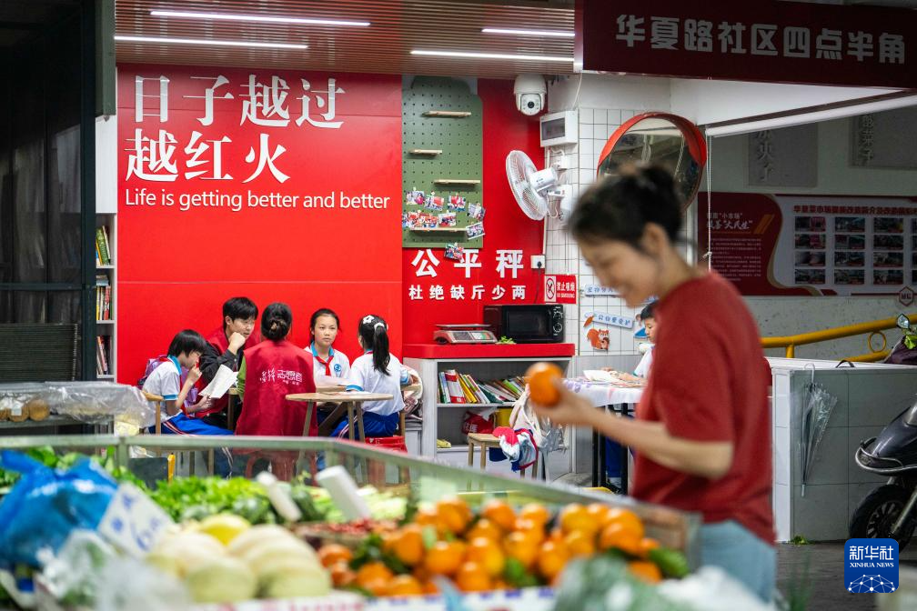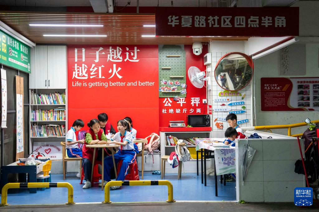 華夏農貿市場建成于2017年,市場面積約3700平方米,有100余家商戶。約九成的商戶子女在附近中小學讀書。每天下午放學以及寒暑假里,多數孩子曾只能在父母的攤位上寫作業和休息。“四點半角”用淡淡書香浸潤市井煙火,為城市增添了一抹溫暖亮色。