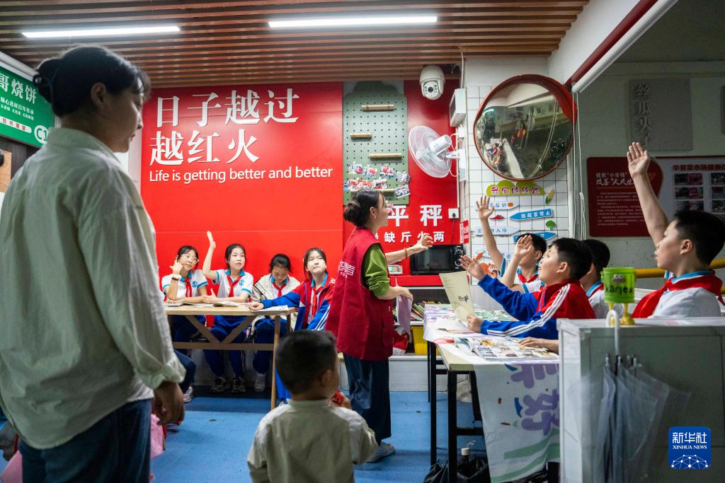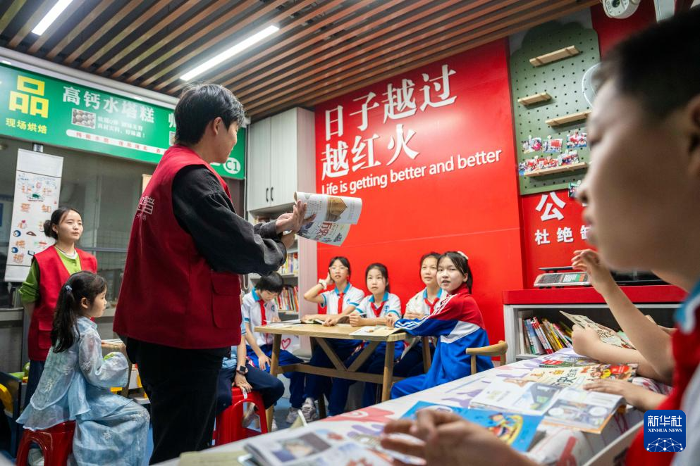 4月23日,志愿者在長沙華夏農貿市場“四點半角”帶領學生閱讀書籍。