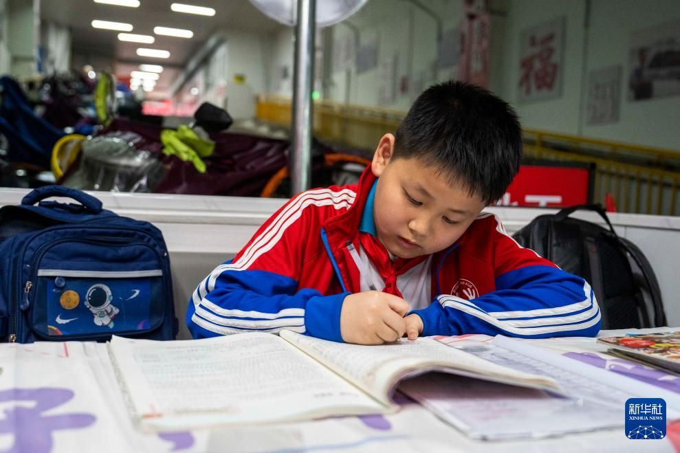 4月23日,學生在長沙華夏農貿市場“四點半角”寫作業。