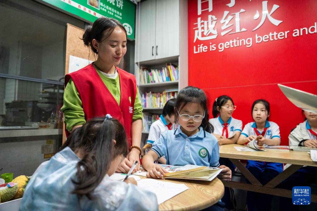 4月23日,志愿者在長沙華夏農貿市場“四點半角”輔導學生功課。