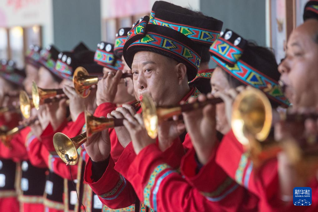 4月28日,苗族同胞在傳統節日踩花山節上演奏樂器。