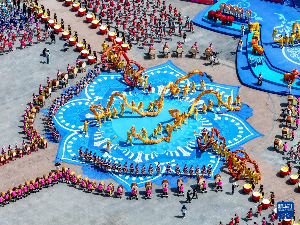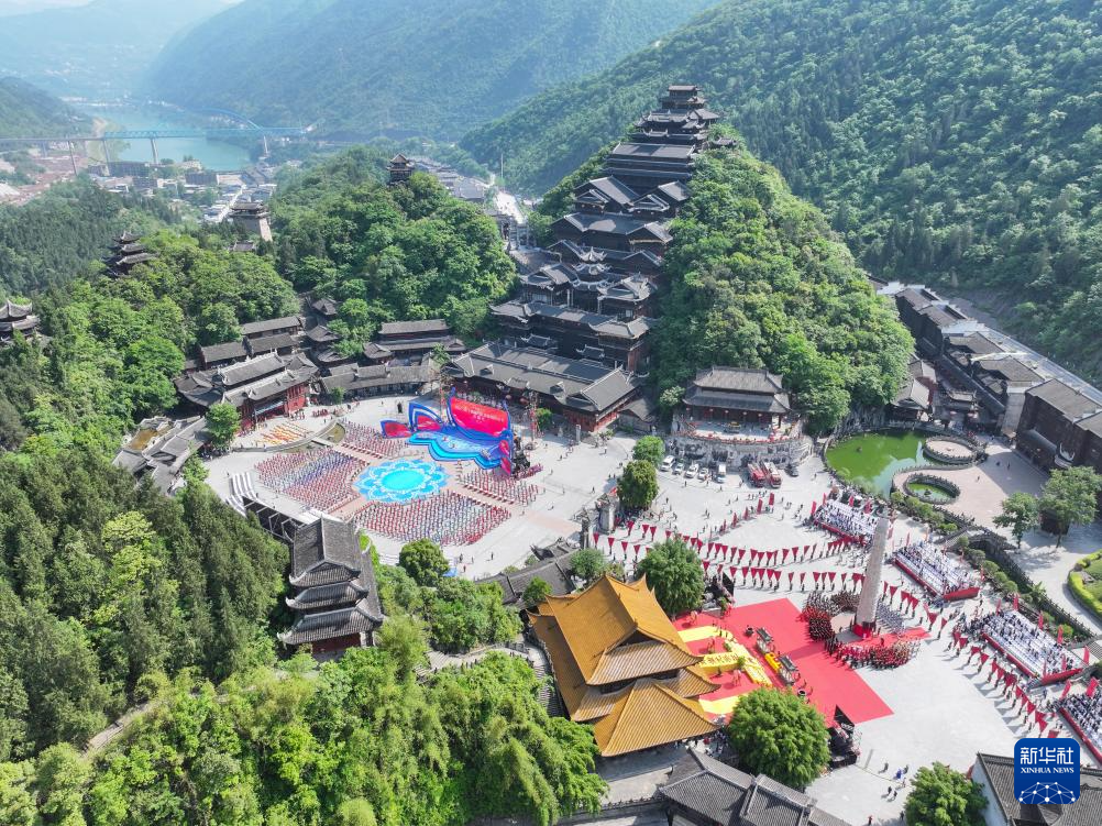 4月28日,苗族同胞在重慶市彭水苗族土家族自治縣的蚩尤九黎城慶祝傳統節日(無人機照片)。