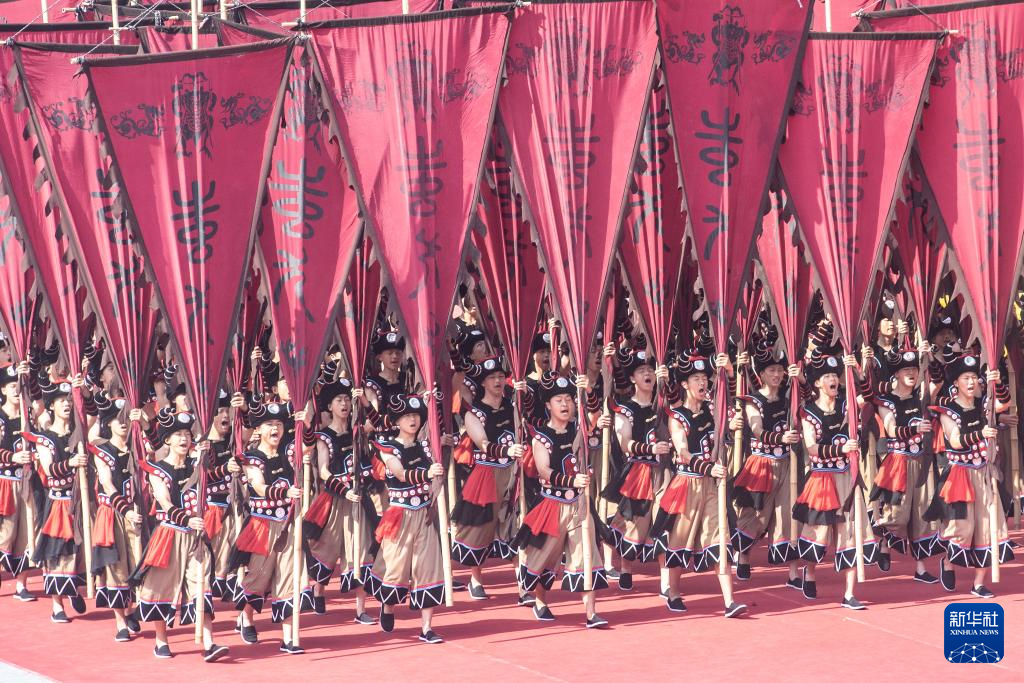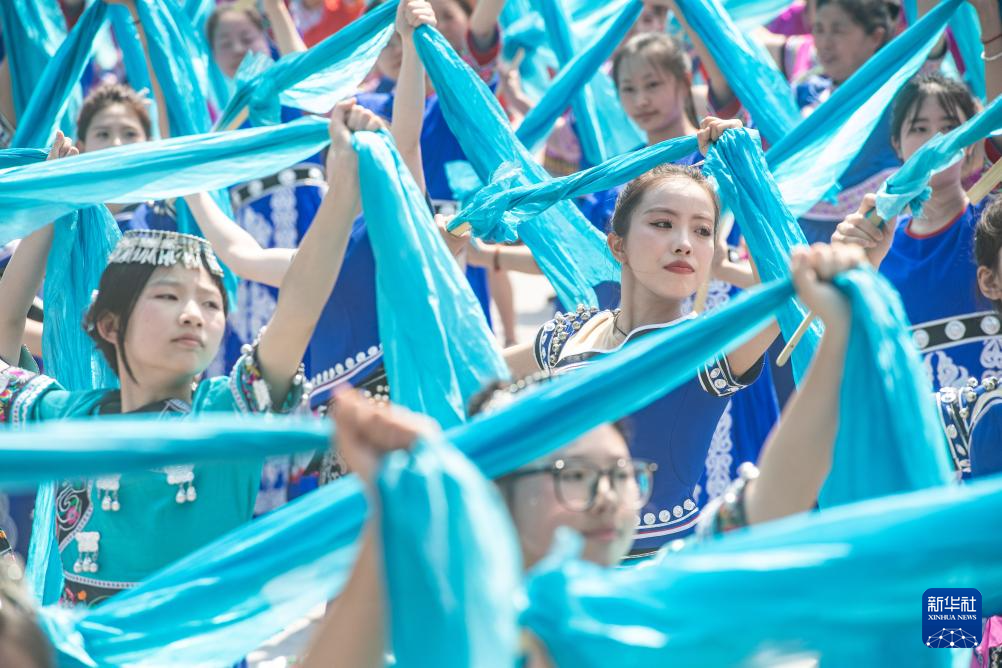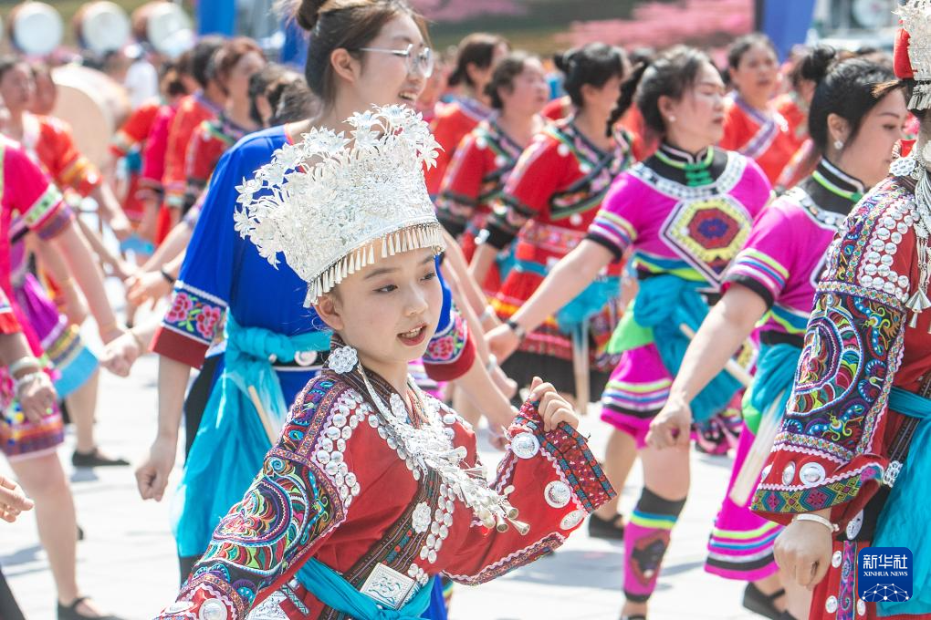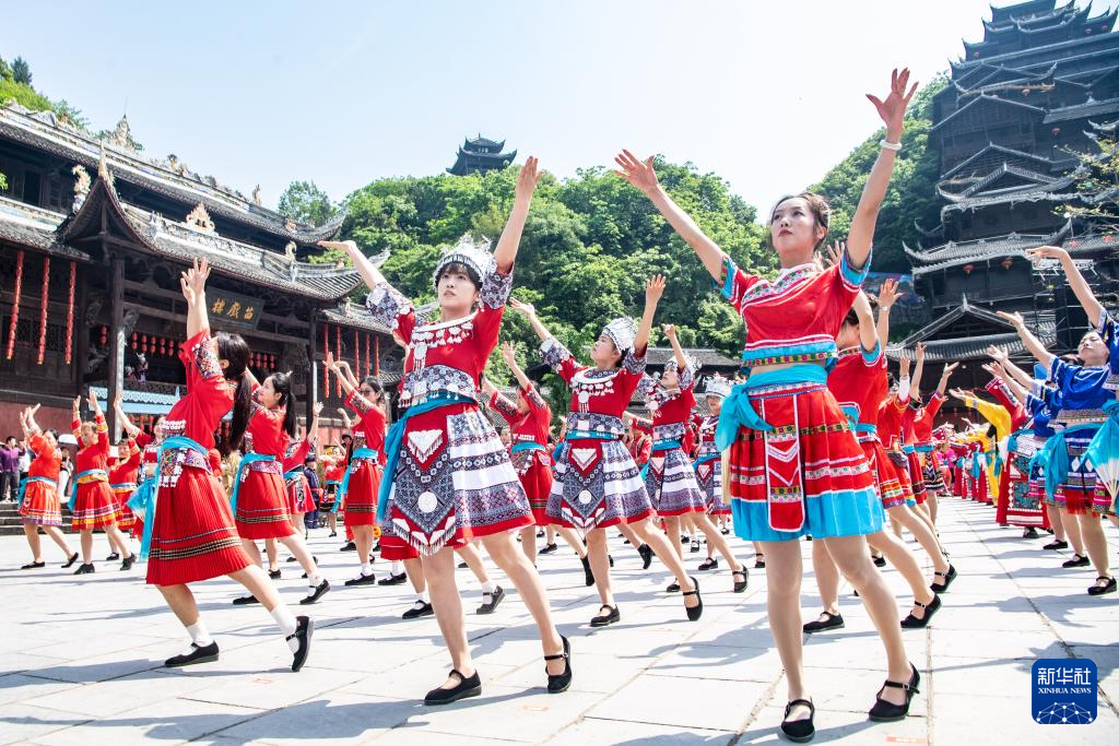當日,第十四屆烏江苗族踩花山節在重慶市彭水苗族土家族自治縣的蚩尤九黎城啟幕。來自全國各地的游客和穿著節日盛裝的苗鄉兒女,同唱嬌阿依、共舞踩花山,一起歡慶苗族的傳統節日。