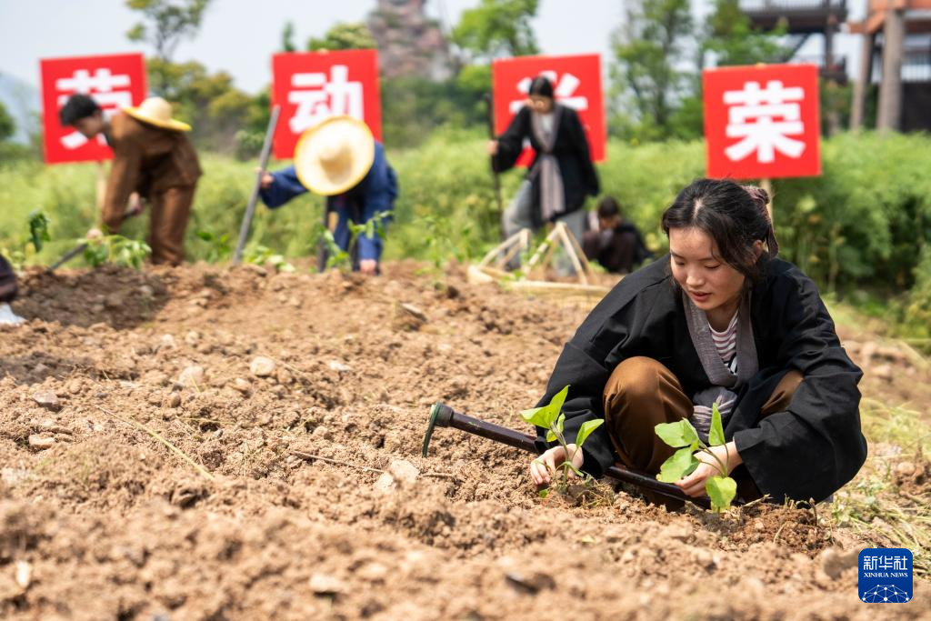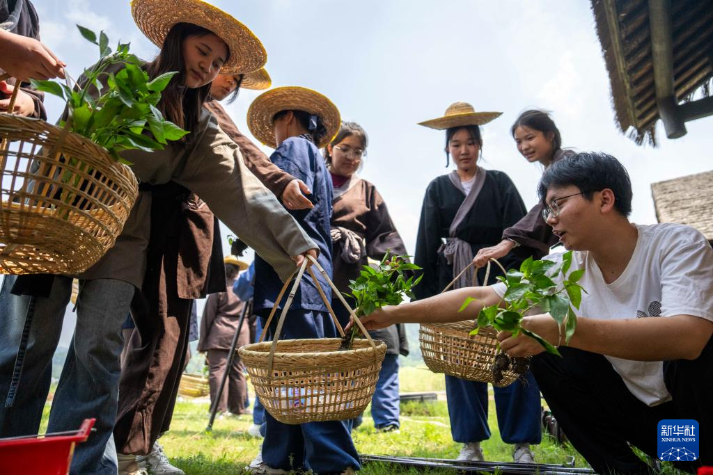 4月28日,在寧鄉市炭河古城景區,學生在進行農耕實踐。
