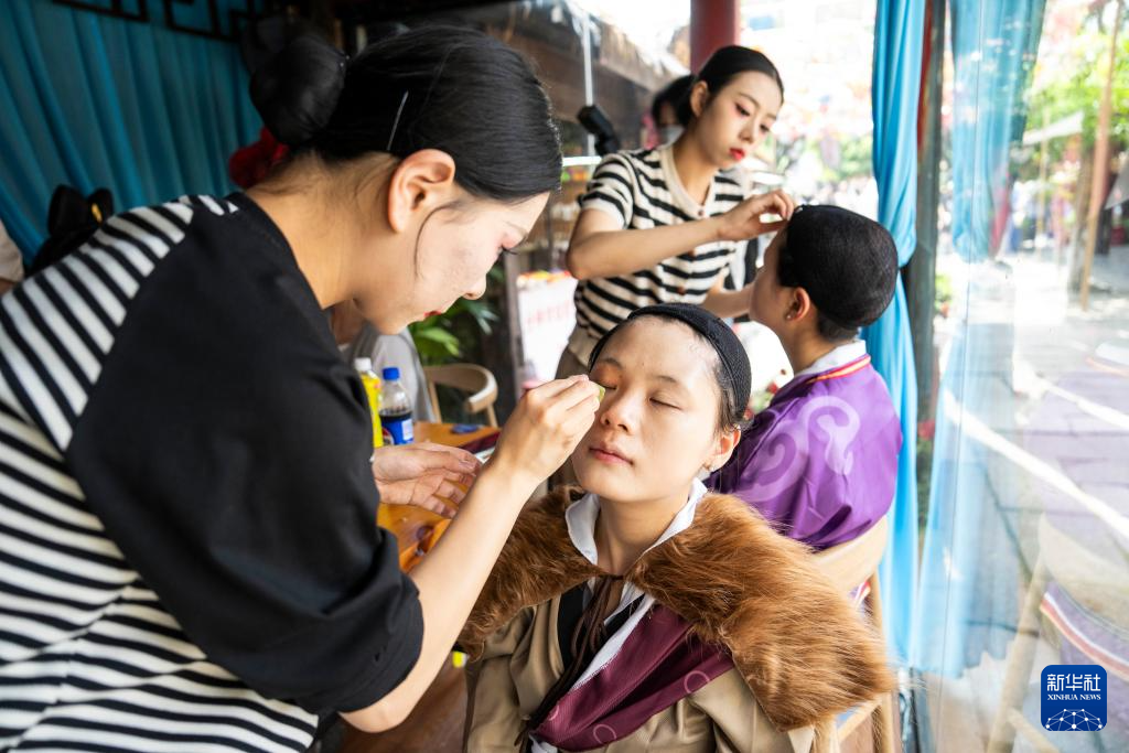 4月28日,在寧鄉市炭河古城景區,學生(左二)在工作前化妝。