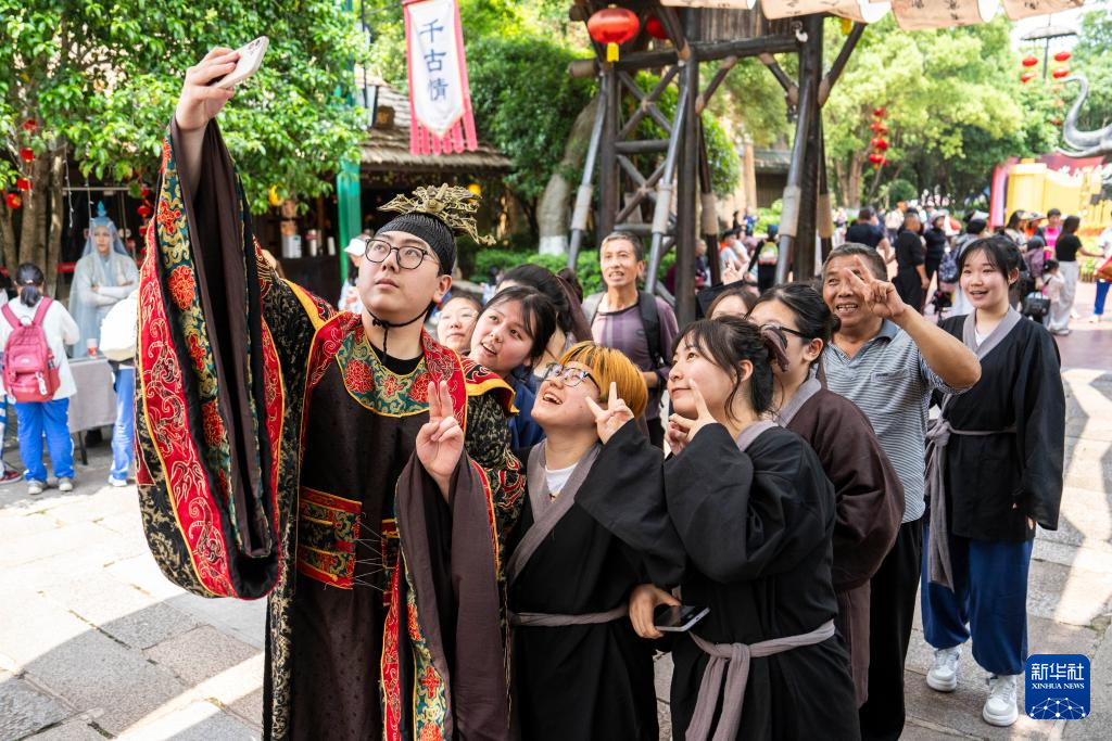 4月28日,在寧鄉市炭河古城景區,學生與景區演員合影。